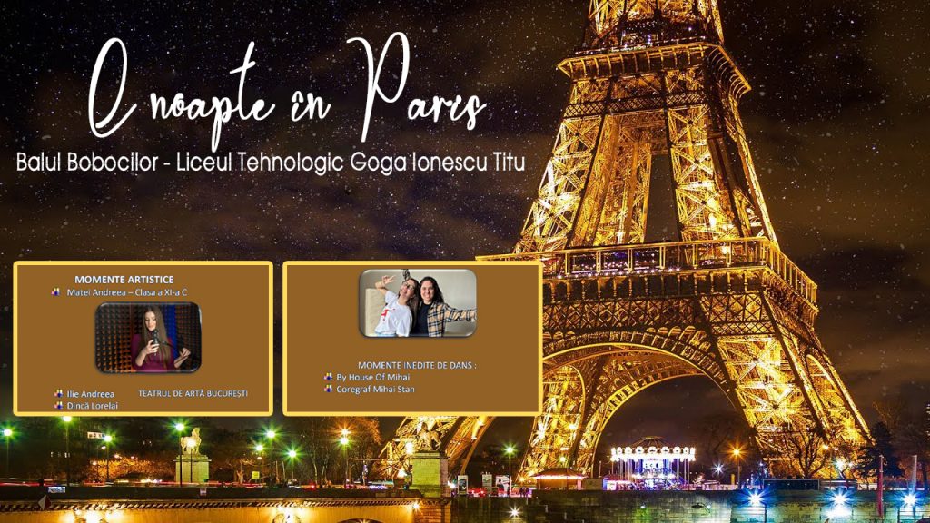 Un nou an școlar,o nouă poveste. Povestea se numește „Balul Bobocilor 2022,tema poveștii este una specială: ” O noapte în Paris „. Protagoniștii sunt demni de a fi priviți,ascultați și apreciați. Narăm frumos pentru a crea amintiri de neuitat!