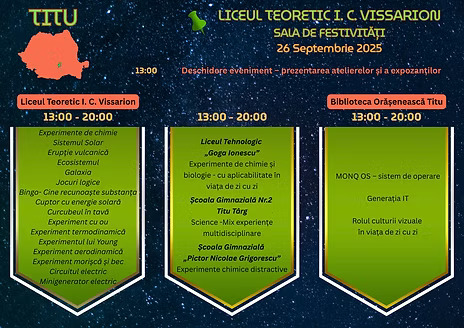 Sala de Festivități a Liceului Teoretic “I.C. Vissarion” Titu va fi gazda evenimentului, unde cei mai prietenoși cercetători îi așteaptă pe toți pasionații de știință, începând cu ora 13:00, să deslușească împreună tainele științei în cele cele mai inedite și captivante moduri.